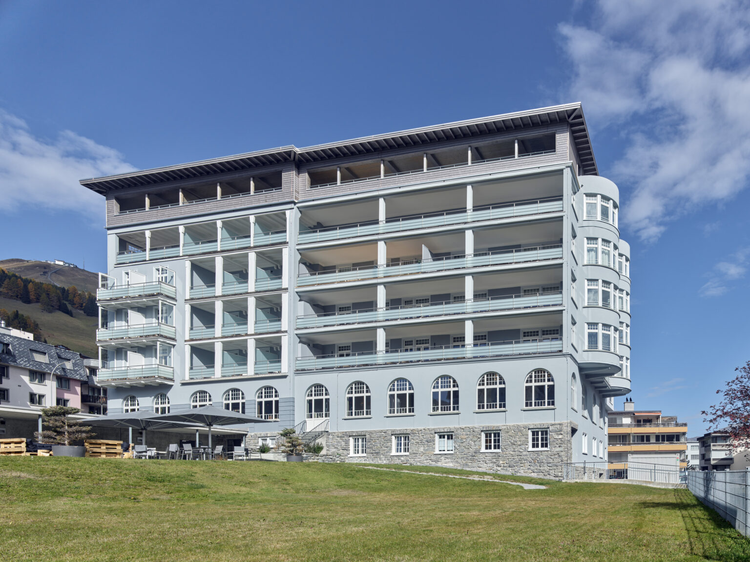 Das unter Denkmalschutz stehenden Alpine Inn, mit seinen 48 Hotelzimmern, wurde umfassend renoviert. Zusätzlich erfuhr das Dachgeschoss eine Aufstockung und beheimatet neu neben weiteren Hotelzimmern auch Zweitwohnungen. Der alte Anbau wurde komplett abgerissen und durch einen Neubau ersetzt. Viel Wert wurde auf den Erhalt des Erscheinungsbilds gelegt. So fügt sich der Neubau stiltechnisch gut zum bestehenden Gebäude ein. Im neu gestalteten Restaurant werden künftig mehrheitlich abends die Gäste kulinarisch verwöhnt. Neben allen Renovationen wurde auch die gesamte Haustechnik erneuert.
