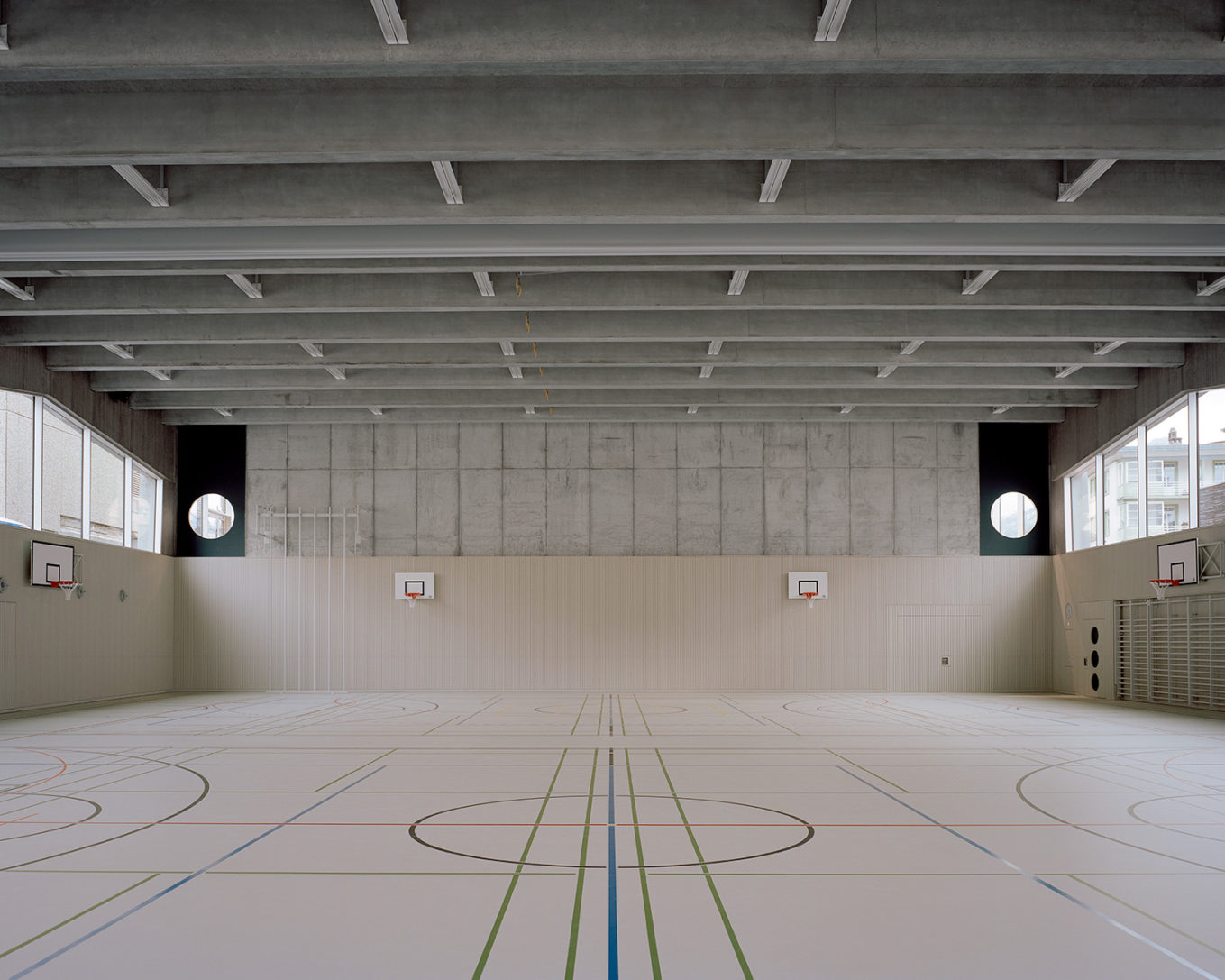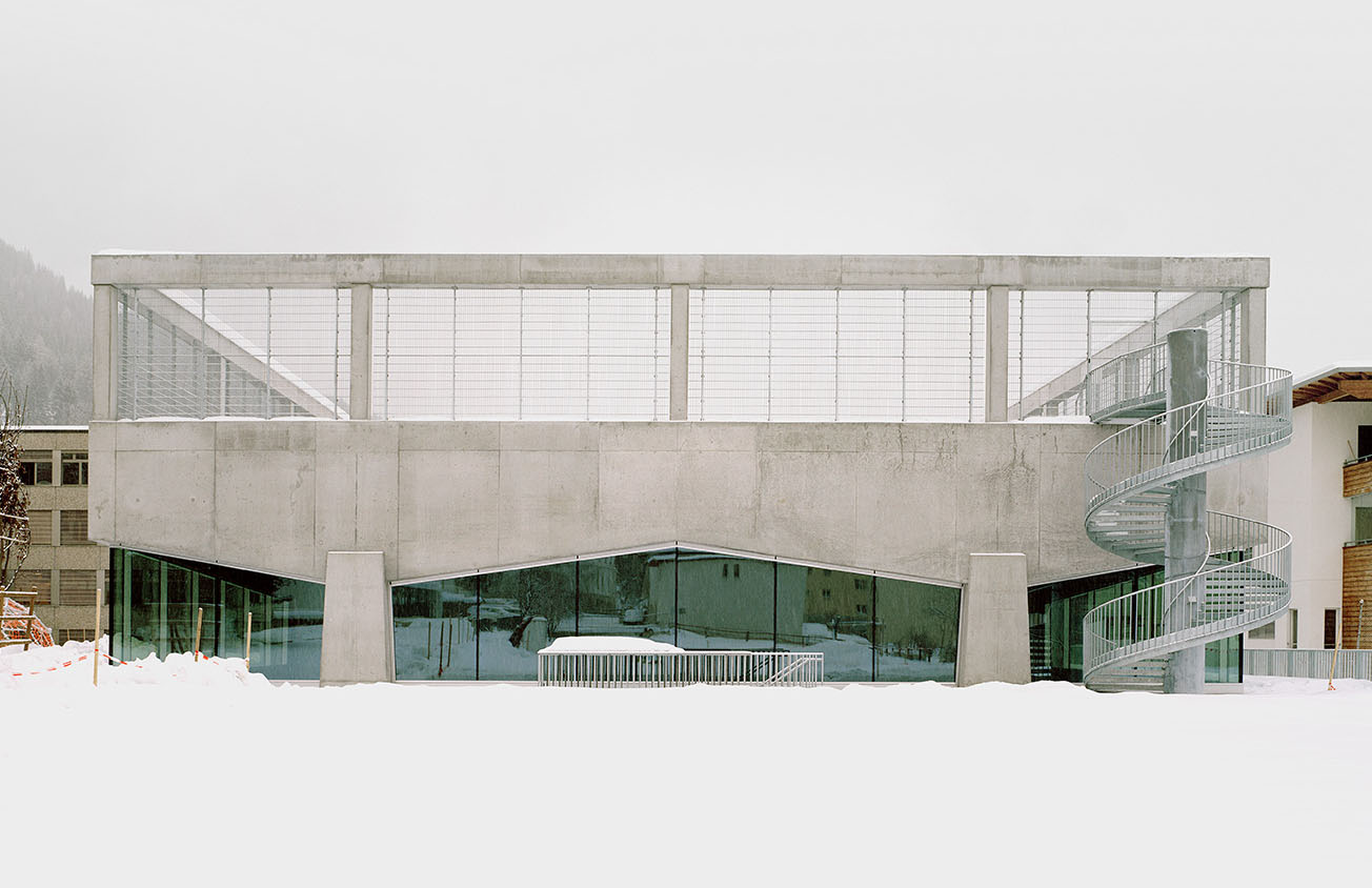 Mit einer Fassade kombiniert aus Beton mit Innendämmung und Glas entstand in Davos eine neue Dreifachturnhalle. Auf dem Dach wurde ein grosser Sportplatz umgesetzt der mit Betonsäulen und Netzen gesichert ist. Platzsparend wurden so zwei Trainingsmöglichkeiten im Innen- und Aussenbereich umgesetzt.