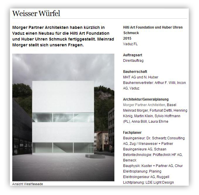 Das Projekt „Hilti Art Foundation und Huber Uhren Schmuck“ in Vaduz FL ist auf www.swiss-architects.com als Bau der Woche präsentiert.